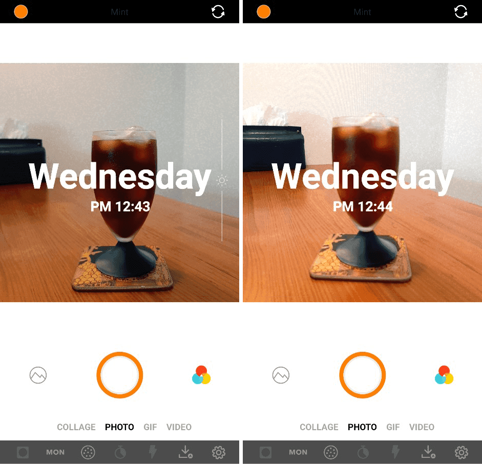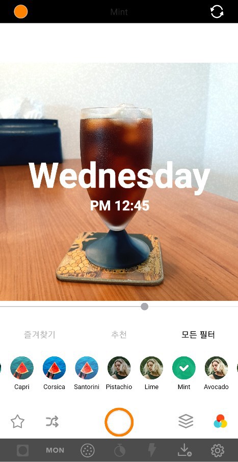 I applied the Mint filter to shoot the glass of coffee. You can slide the filter buttons sideways to pick a filter, or you can slide the viewfinder sideways, and the filters will change in the same way. Every time I use Retrica, I find it really intuitive and convenient to use.