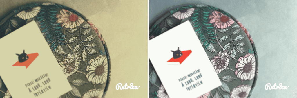 I took a picture of a pretty sitting cushion with floral patterns using the Rigel filter, which gives an antique feel like a disposable film camera. I also applied the Blur effect to make the surroundings slightly blurred, which makes the floral patterns stand out more clearly. With Retrica’s logo stamp added, the picture takes on a classic feel.