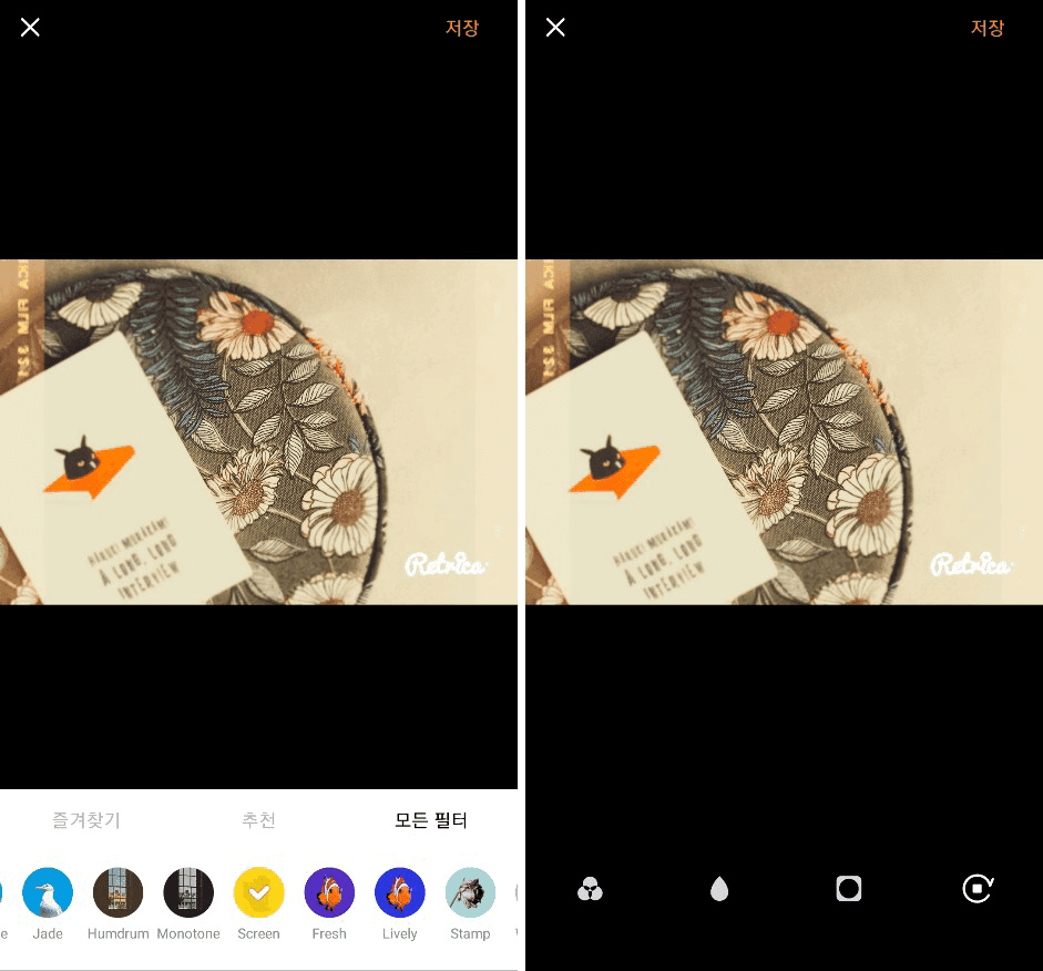 Retrica has diverse filters and effects available, which you can combine to produce completely different results than when you use only one of them. You can add variety to the light and color of a picture with a filter and then apply an effect to make it a cool picture. Or you can create a feel of your own by applying more than one filter.