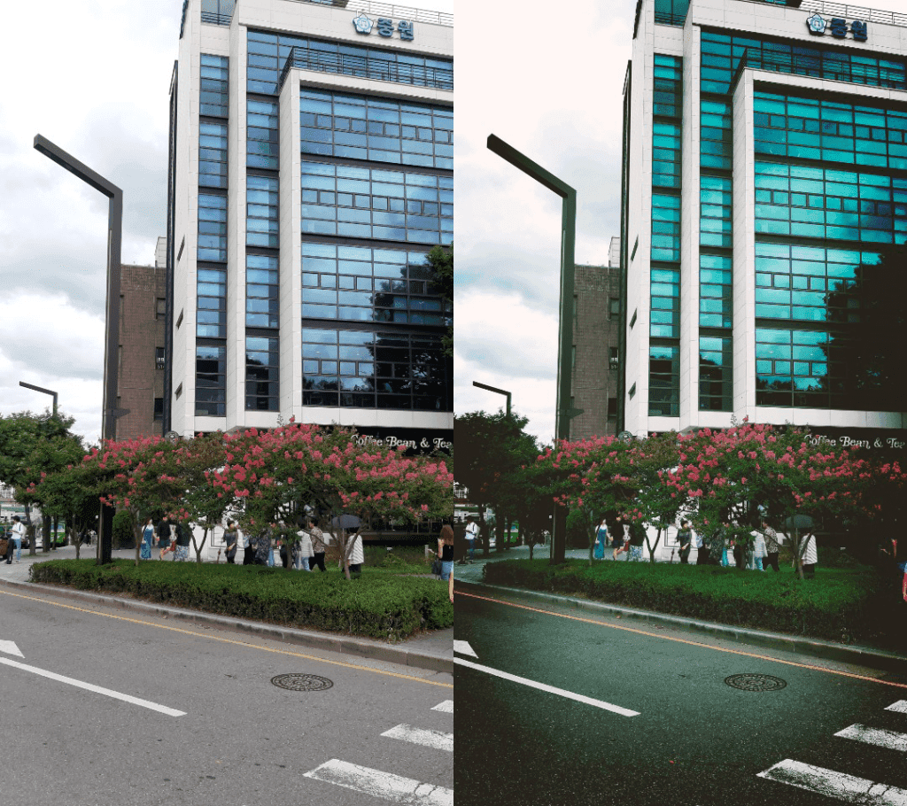 *Street across the Seoul Arts Center. Left – original photo, right – Lime filter applied with Vignetting Level 2 added